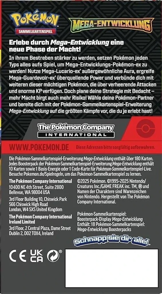 In ihrem Bestreben stärker zu werden, setzen Pokémon jeden Typs alles aufs Spiel, um Mega-Entwicklungs-Pokémon-ex zu werden! Nutze Mega-Lucario-ex’ außergewöhnliche Aura, ergreife Mega-Guardevoir-ex’ überquellende Power und verbünde dich mit weiteren dieser mächtigen Pokémon, die über verheerende Attacken und enorme KP verfügen. Doch plane deine Strategie mit Bedacht – mehr Macht birgt auch mehr Risiko! Wähle deine Pokémon-Partner und bereite dich mit der Pokémon-Sammelkartenspiel-Erweiterung Mega-Entwicklung auf die größten Kämpfe vor, die du je erlebt hast!