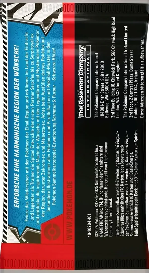 Feiere das Wiedersehen mit den Pokémon der Einall-Region und erklimme im Land der Eintracht und Legenden als Trainer die Spitze! Entwickle den ersten Partner Serpifeu bis zu Serpiroyal-ex und entdecke die inspirierende Macht der Wünsche mit den Legendären und Mysteriösen Pokémon der Region, darunter Zekrom-ex und Meloetta-ex. Achte beim Ausfüllen deines Pokédex auf besondere Illustrationen aller Pokémon und Parallelkarten mit Pokéball-Muster in der Pokémon-Sammelkartenspiel-Erweiterung Karmesin & Purpur – Schwarze Blitze!