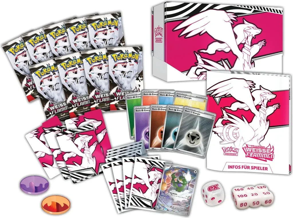 - Inhalt: 9 Boosterpacks Weiße Flammen, 1 holografische Promokarte (Boreos), 65 Kartenhüllen, 45 Energiekarten, 6 Schadensmarkenwürfel, 1 official Münzwurf-Würfel, 2 Spezialzustandsmarken, 1 Sammelbox mit 4 Trennern, 1 Code-Karte für Pokémon TCG Live